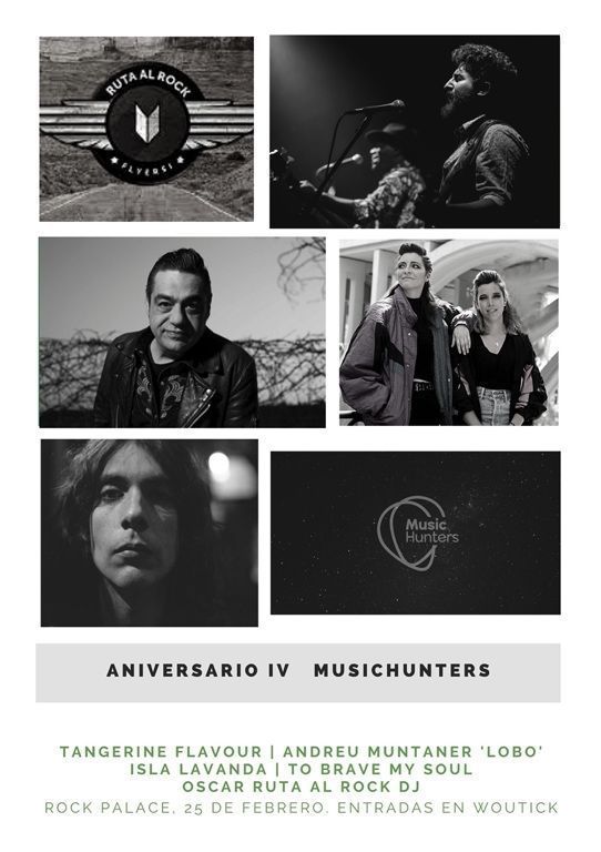 En esta ocasión se subirán al ilustre escenario de la sala de Atocha los esperados Tangerine Flavour con sus nuevas canciones, además de uno de los nombres propios del rock español, Andreu Muntaner ‘Lobo’. Isla Lavanda vuelven con muchas novedades y una formación renovada y de mucha calidad, y Rafa de To Brave My Soul va a enseñarnos al fin sus temas en vivo. Oscar de Ruta al Rock será el encargado de llenar de temazos lo que quede de una noche que pinta bien jugosa. ¡Larga vida a los cazadores musicales!