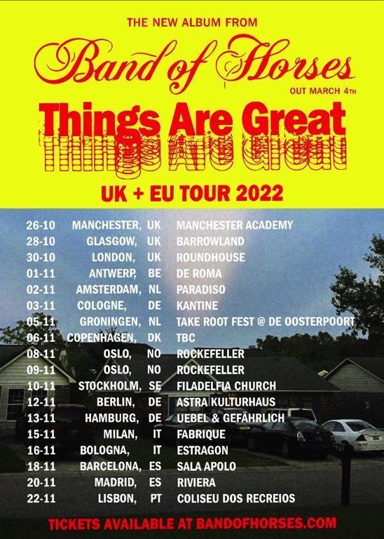 La banda de Seattle estarán en Barcelona el 18/11 y el 20/11 por Madrid. ‘Things Are Great’ saldrá a la venta el 4 de marzo de 2022 a través de BMG y se perfila como uno de sus mejores lanzamientos hasta la fecha. Con canciones como «Lights», «In Need of Repair» y «Crutch» (esta última alcanzó el número 1 en la lista de éxitos de la radio AAA, marcando el primer topper de la banda), su sexto álbum de estudio y primer disco en más de cinco años muestra a una banda en su mejor momento. Sonoramente, el álbum es un retorno a su trabajo anterior y al tipo de ética cruda que se encuentra en el corazón de Band of Horses.