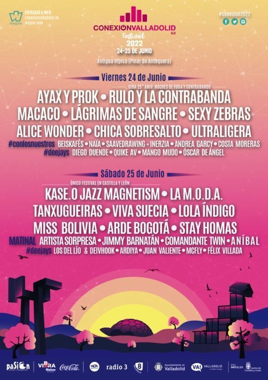 El sábado 24 de junio, Kase O. Magnetism referente nacional del RAP será su única fecha en Castilla y León. La M.O.D.A., un imprescindible del Conexión, un septeto que se mueve entre el Folk, blues, Rock e incluso Funk que rompe récords de sold out. Tanxugeiras, artistas revelación del año, estas gallegas cantareiras, fusionan la música tradicional de su tierra con los sonidos de su generación. Viva Suecia, indie shoegaze de explosiva puesta en escena. Lola Índigo, la niña urbana, la mujer street.