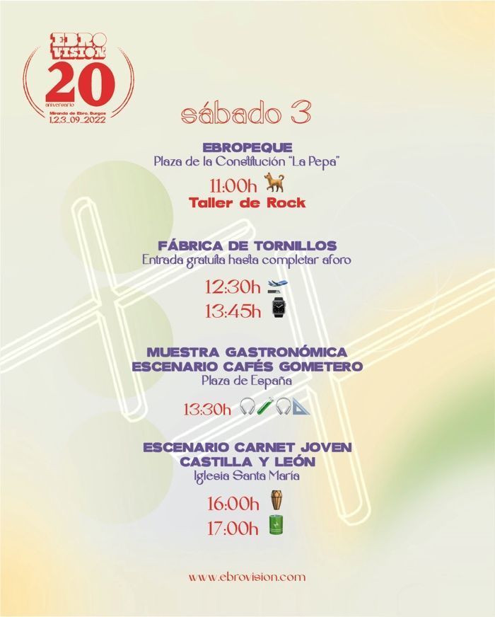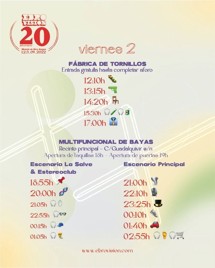Tras agotar los abonos y entradas de día con un cartel totalmente anónimo, Festival Ebrovisión ya ha publicado los horarios de su edición XX aniversario, que tendrá lugar en Miranda de Ebro los próximos 1, 2 y 3 de septiembre.