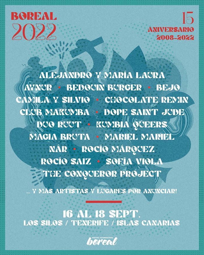 La música volverá a ser uno de los fundamentos vitales de Boreal. Este 2022 contará, entre otros, con representantes de Siria, Turquía, Líbano, Sudáfrica, con especial atención a los dos países invitados de esta edición, Chile y Argentina. Nombres como el de las españolas Rocío Márquez y Rocío Saiz, el canario Bejo o la turca Aynur volverán a situar al Festival en el mapa de las citas culturales más importantes y con más personalidad de España.