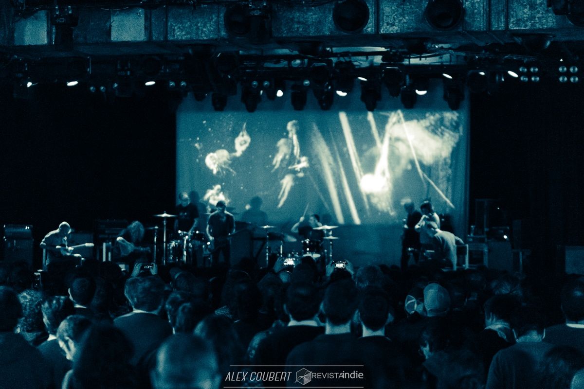 Anoche en La Riviera, Godspeed You! Black Emperor levantó un muro de sonido tan espeso y contundente que hizo que todos los presentes nos quedáramos atrapados la hora y pico que duró el concierto. Imagina una vieja proyección de celuloide salpicada de polvo y arañazos, como una alucinación muda que rebota en la pantalla mientras el bajo retumba a la altura del esternón. Eso fue lo que se vivió: un trance construido a golpe de violín, guitarrazos y percusiones que jamás dejaban de pulir el alma de quienes se dieron cita allí.