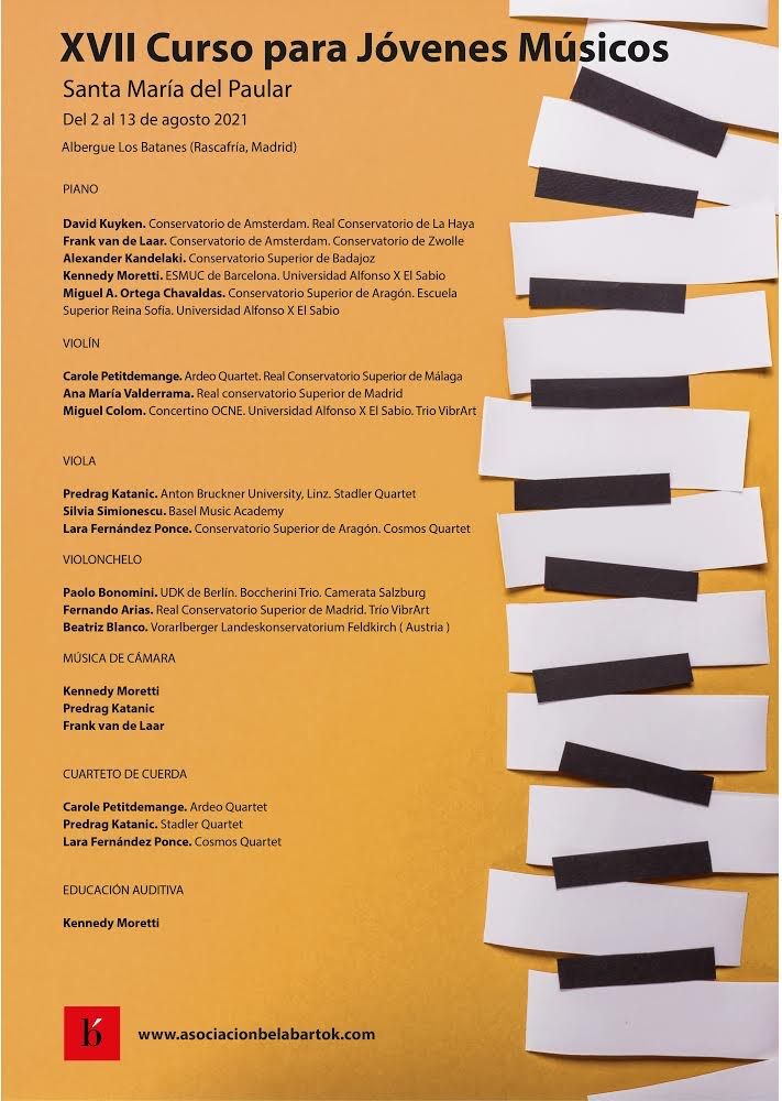 Del 2 al 13 de agosto de 2021 se celebrará en el Albergue Los Batanes (Rascafría, Madrid) una nueva edición del curso organizado por la Asociación Musical Béla Bartók, y enfocada a los instrumentistas de piano, violín, viola, violonchelo y música de cámara.