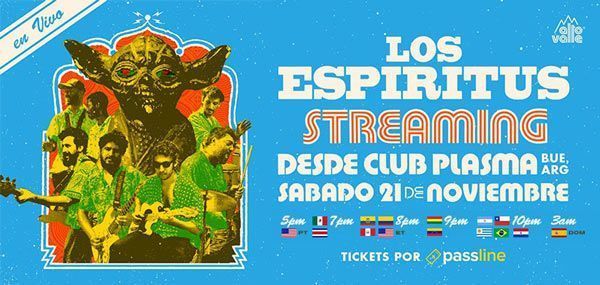 Los Espíritus anuncian su primera presentación en vivo vía streaming el próximo sábado 21 de noviembre de 2020 desde Club Plasma, el espacio cultural que supo albergar a miles de artistas durante casi 20 años en la Ciudad de Buenos Aires y donde se encuentra el estudio donde la banda produjo casi todo su material discográfico. El concierto se transmitirá para todo el mundo a través de Passline y ya se pueden adquirir los tickets de acceso según la zona geográfica. Para esta ocasión, los músicos invitados que acompañarán a la banda son los percusionistas, Santiago Córdoba y los hermanos Gali y Mohamed Camara.