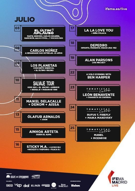 IFEMA MADRID LIVE es una firme apuesta por la recuperación del ocio presencial y seguro en Madrid, que irá sumando citas y programaciones de gran interés a lo largo del año. Un proyecto que aglutina una oferta cultural amplia, para todos los públicos, y que representa el espíritu abierto de la ciudad. Entre sus propuestas para este verano, más de una treintena de artistas en un total de quince conciertos se darán cita este julio en La Explanada, un espacio al aire libre en el Recinto Ferial, con más de 28.000 m2, que contará con un aforo sentado en pista y grada y una amplia zona de hostelería y ocio. Todo en un entorno escénico con la mayor calidad de sonido y cercanía al espectáculo, adaptado a las medidas y protocolos de seguridad desarrollados por IFEMA MADRID.