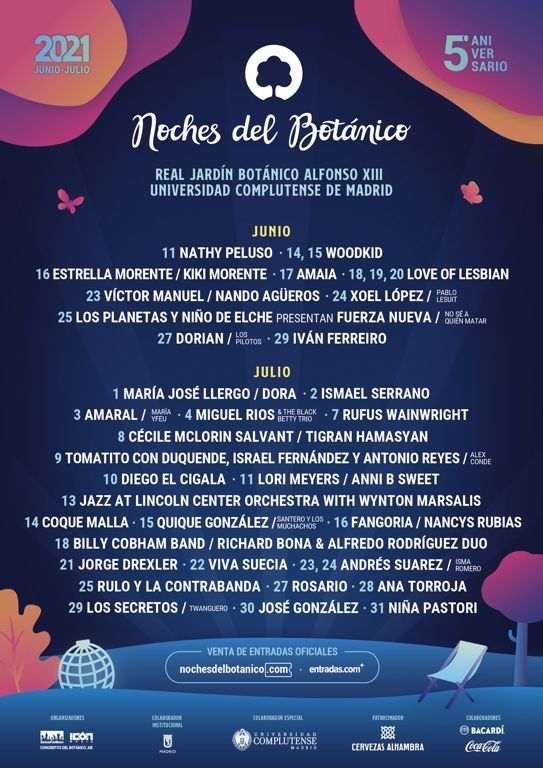 Noches del Botánico anuncia la celebración de su 5º aniversario, que se llevará a cabo durante los meses de junio y julio de 2021. Esta nueva y especial edición supone el reencuentro con el público madrileño, que podrá disfrutar del regreso de los conciertos en directo, al aire libre y dentro del entorno mágico del Real Jardín Botánico Alfonso XIII de la Universidad Complutense de Madrid.
