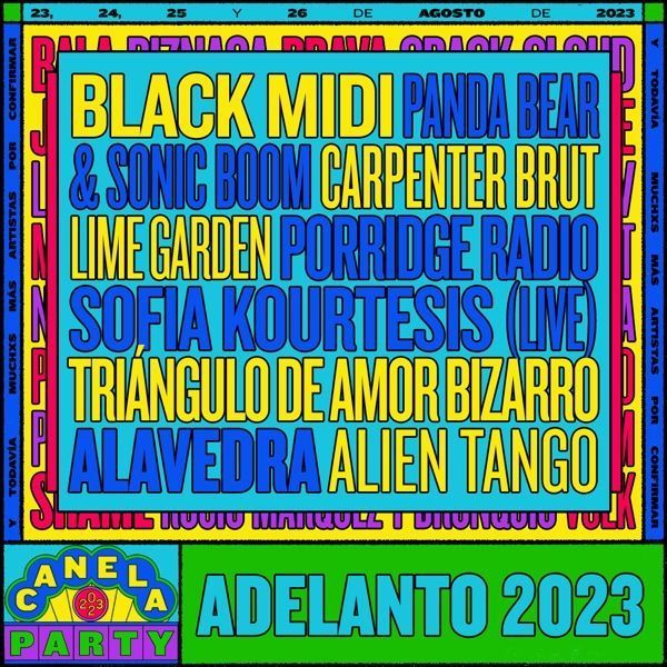 Hasta 9 nuevos nombres se incorporan al ya de por sí impresionante line up del CanelaParty 2023, configurando uno de los carteles más completos de nuestra geografía. Confirmaciones internacionales del calibre de black midi, Panda Bear & Sonic Boom, Carpenter Brut, Sofía Kourtesis (Live), Lime Garden o Porridge Radio, y nacionales como Triángulo de Amor Bizarro, Alavedra o Alien Tango. Un auténtico aluvión de propuestas, a cada cual más interesante, que se darán cita en el decimoquinto pitote del 23 al 26 de agosto de 2023.