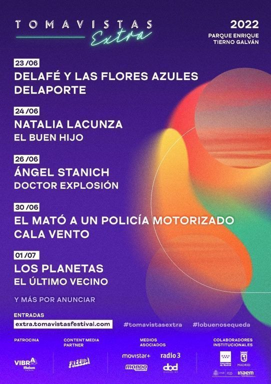 Una programación única en el parque Enrique Tierno Galván que contará con la presentación en exclusiva en Madrid de los discos de grandes nombres del panorama nacional y latinoamericano. Y es que Los Planetas, El Último Vecino, Natalia Lacunza, El Mató a un Policía Motorizado, El Buen Hijo, y Doctor Explosión ofrecerán en Tomavistas Extra su único concierto en la capital con sus nuevos trabajos.