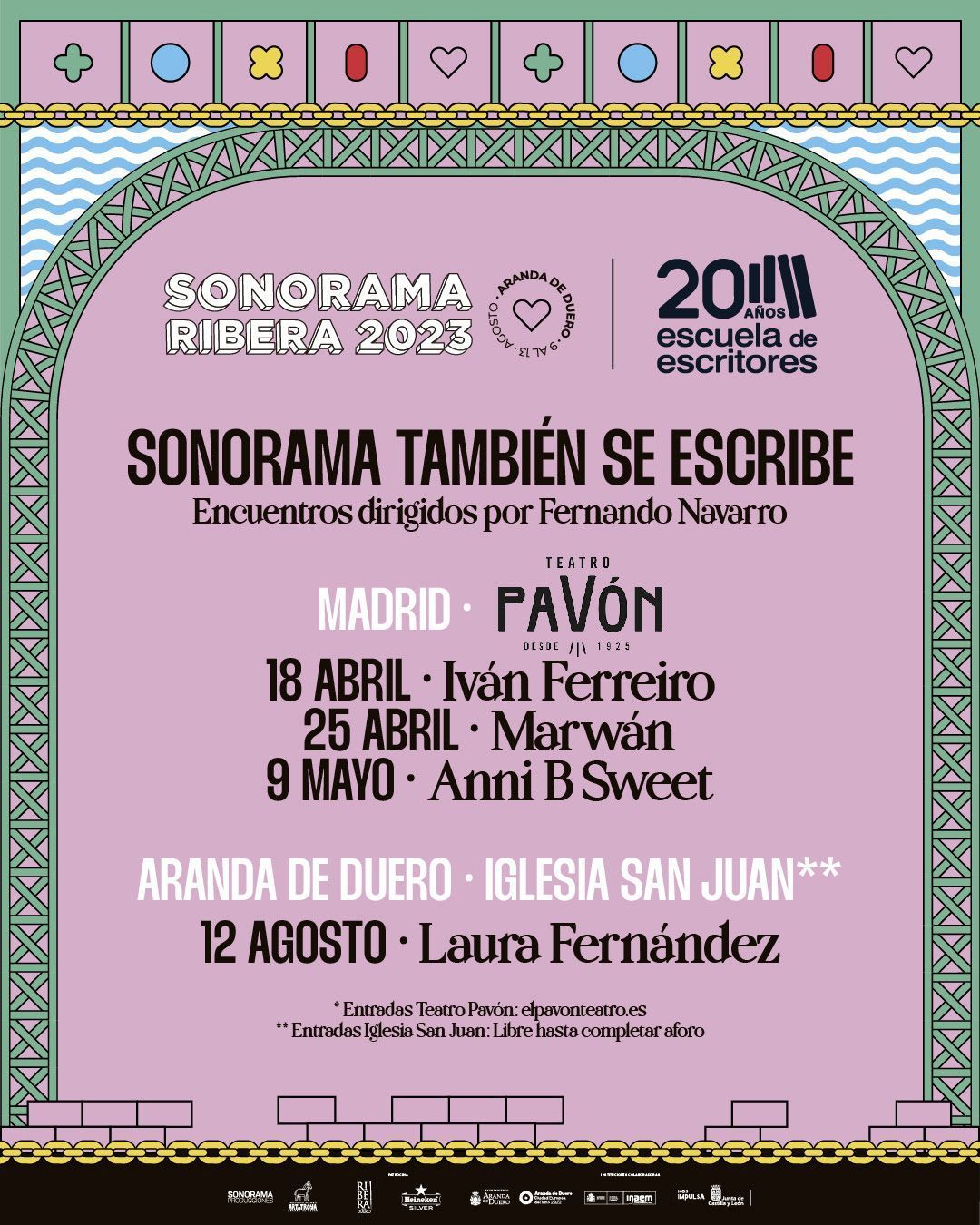 En esta segunda edición de Sonorama también se escribe contaremos con Iván Ferreiro (18 de abril), Marwan (25 de abril) y Annie B Sweet (9 de mayo). En agosto será el turno de la escritora Laura Fernández, que viajará a Aranda de Duero el 12 de agosto para participar en la 26º edición del festival en una charla sobre rock y literatura con Fernando Navarro.