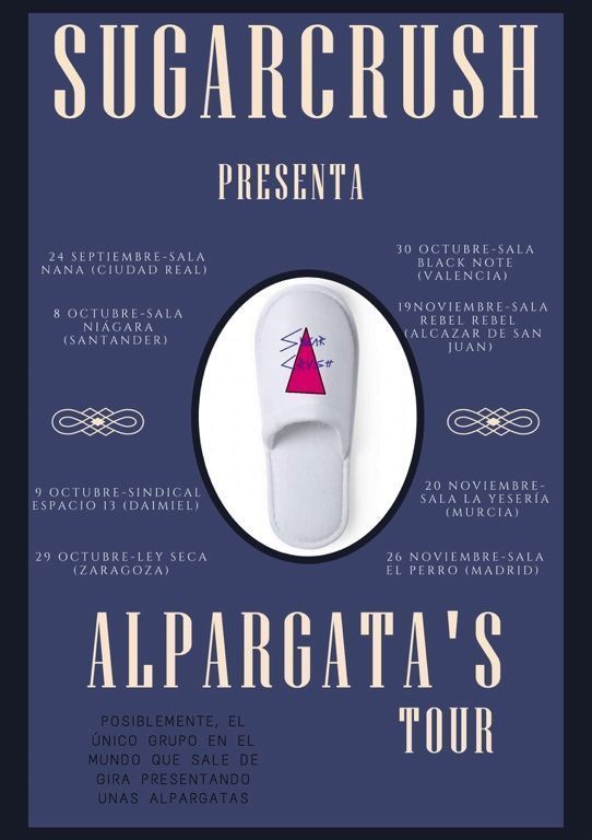 Nos hemos colado en uno de los locales de ensayo más locos de toda España para hablar con Sugarcrush, la banda manchega de power pop (trans-yeyé) que más melocotonazos factura por minuto quienes están inmersos en su nueva gira, Alpargata’s Tour, que les llevará por media España. Su guitarrista y cantante Juanjo Soguero nos atiende en chanclas y pantalón corto sentado sobre un viejo serijo de esparto.