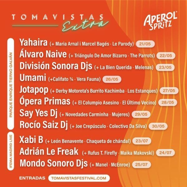 Yahaira, Alvaro Naive, División Sonora, Umami, Jotapop, Ópera Primas, Say Yes, Rocío Saiz, Xabi B, Adrián Le Freak y Mondo Sonoro serán los protagonistas de las sesiones DJ de Tomavistas Extra 2021.