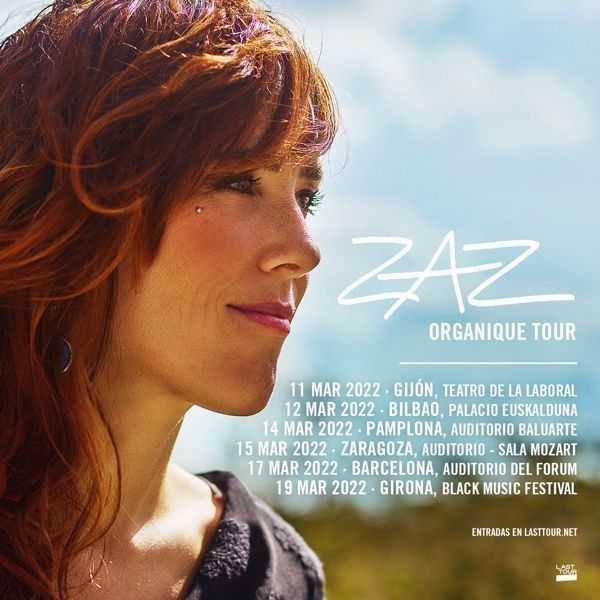 La gira de Zaz ORGANIQUE TOUR llegará a nuestro país en marzo de 2022 y pasará por 6 de las principales ciudades. Arrancará el día 11 en el Teatro de La Laboral en Gijón, para continuar el 12 en el Palacio Euskalduna de Bilbao, el 14 en el Auditorio Baluarte de Pamplona, el 15 en la Sala Mozart del Auditorio de Zaragoza, el 17 en el Auditori Fòrum de Barcelona y se despedirá el 19 de marzo en el marco del Black Music Festival de Girona.